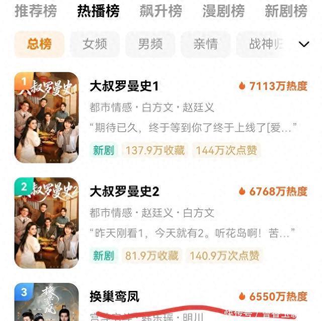 更离谱的是,剧都播完了,热度没掉反而涨。1月最新短剧榜单,《换巢鸾凤》仍挂在前五,旁边标注“10星推荐”。
